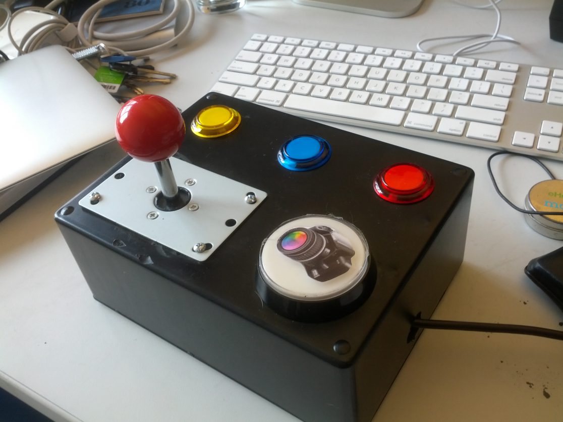 People who step in front of the camera can choose a background, special effect, and scene partner by pushing arcade buttons, then adjust the composition of the image using a joystick. They then pose, and push a big button to instantly capture the image. The image appears on an overhead monitor for everyone to see, photograph and share. It’s also automatically uploaded to a site where it’s immediately available to be downloaded and shared.