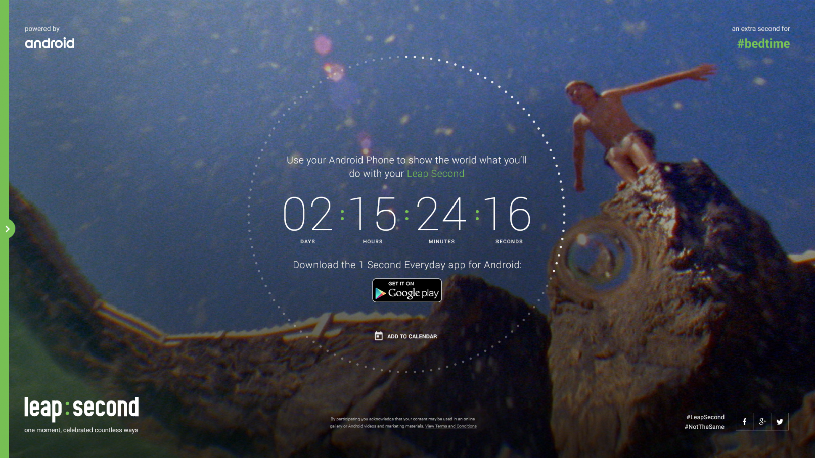 On June 30, 2015, an extra second was added to the World Clock. This phenomenon is known as a leap second. We asked people to use their Android phones to show us what they did with their extra moment. We partnered with the app 1SecondEveryday, through which thousands of users submitted videos on the day. We created a web experience that turned these submissions into an infinite grid of browseable, searchable videos rendered in WebGL.