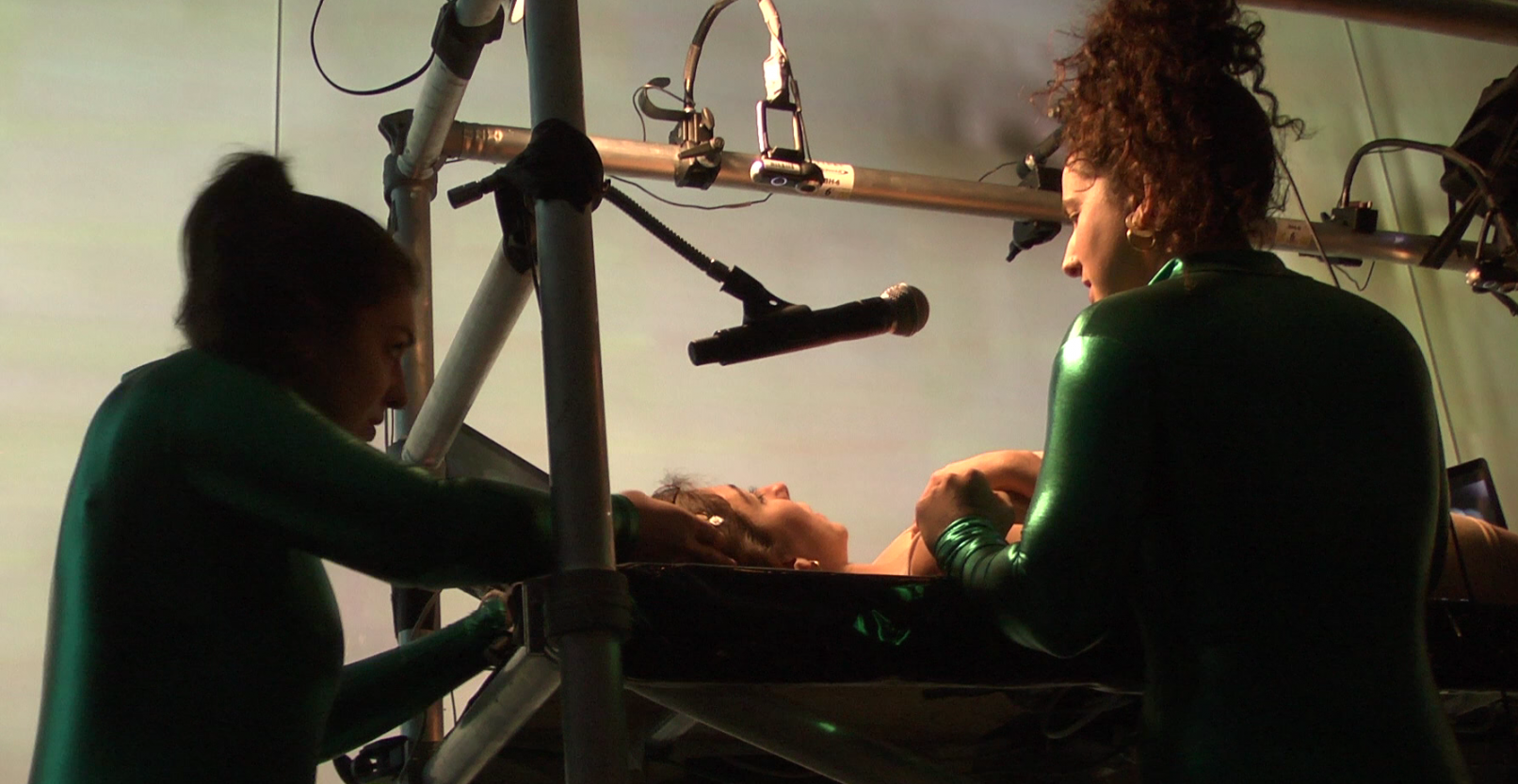 The performance takes the form of a hypothetical body modification in which a patient’s spiritual essence is extracted and implanted on their exterior. Two technicians guide a patient through this fictional process with verbal instructions, and dissect her body with a microscope, traveling inside her eye and stomach to hunt down her spirit. In the world of this performance, the procedure exists somewhere between a boob job, a spa treatment, and a permanent kabbalah bracelet.
